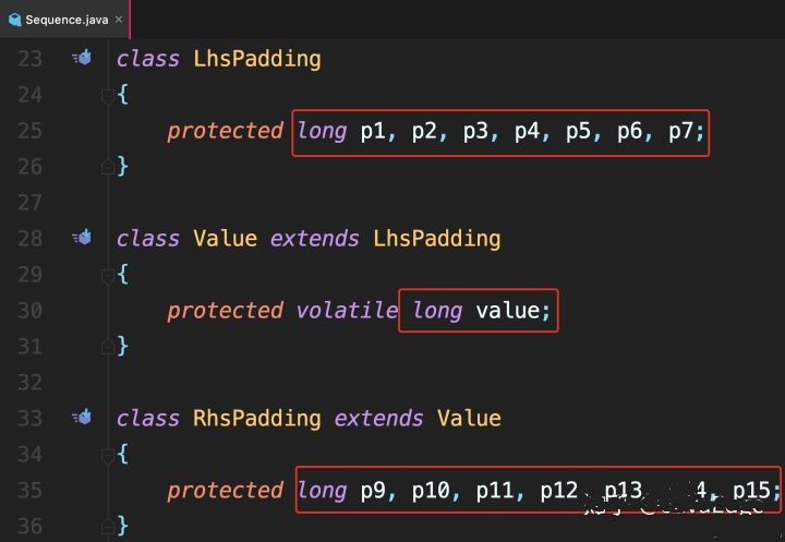 可看成是一个AtomicLong用于标识进度。还有另外一个目的就是防止不同Sequence之间CPU缓存伪共享(Flase Sharing)的问题。 - 如下设计保证我们保存的 value 永远在一个缓存行中。(8 个long,正好 64 字节)。这也是一个空间换时间的案例。