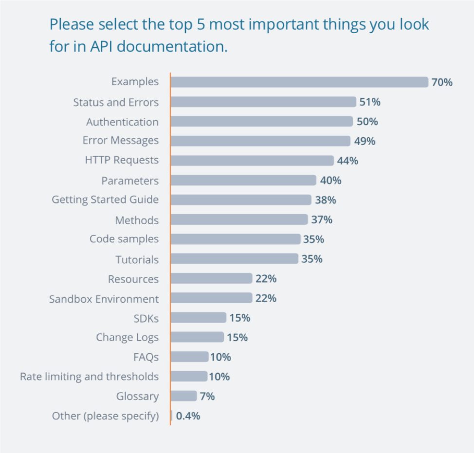 2019 年,Swagger 的开发者 SmartBear对 API 开发者和用户进行了调查。他们发现了社区中哪些文档功能被认为是最重要的,为我们提供了开发人员想要涵盖的必备文档部分的列表。我们将通过其中一些。