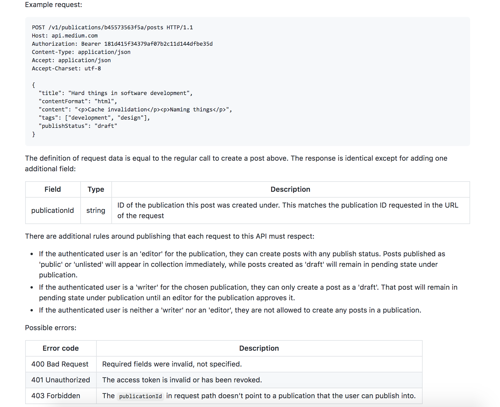 Medium API 文档不一定遵守我们今天列出的所有规则,但它们非常适合此 API 支持的有限功能 - 在 Medium 上发布和搜索出版物。它们在 GitHub 上共享,内容非常简短但清晰,包含大量示例,每个示例都以代码中提到的所有参数的抄本结尾,包括可能的错误。它非常简单但可靠——所有建议都可以直接在 GitHub 上提出,并且文档会定期更新。