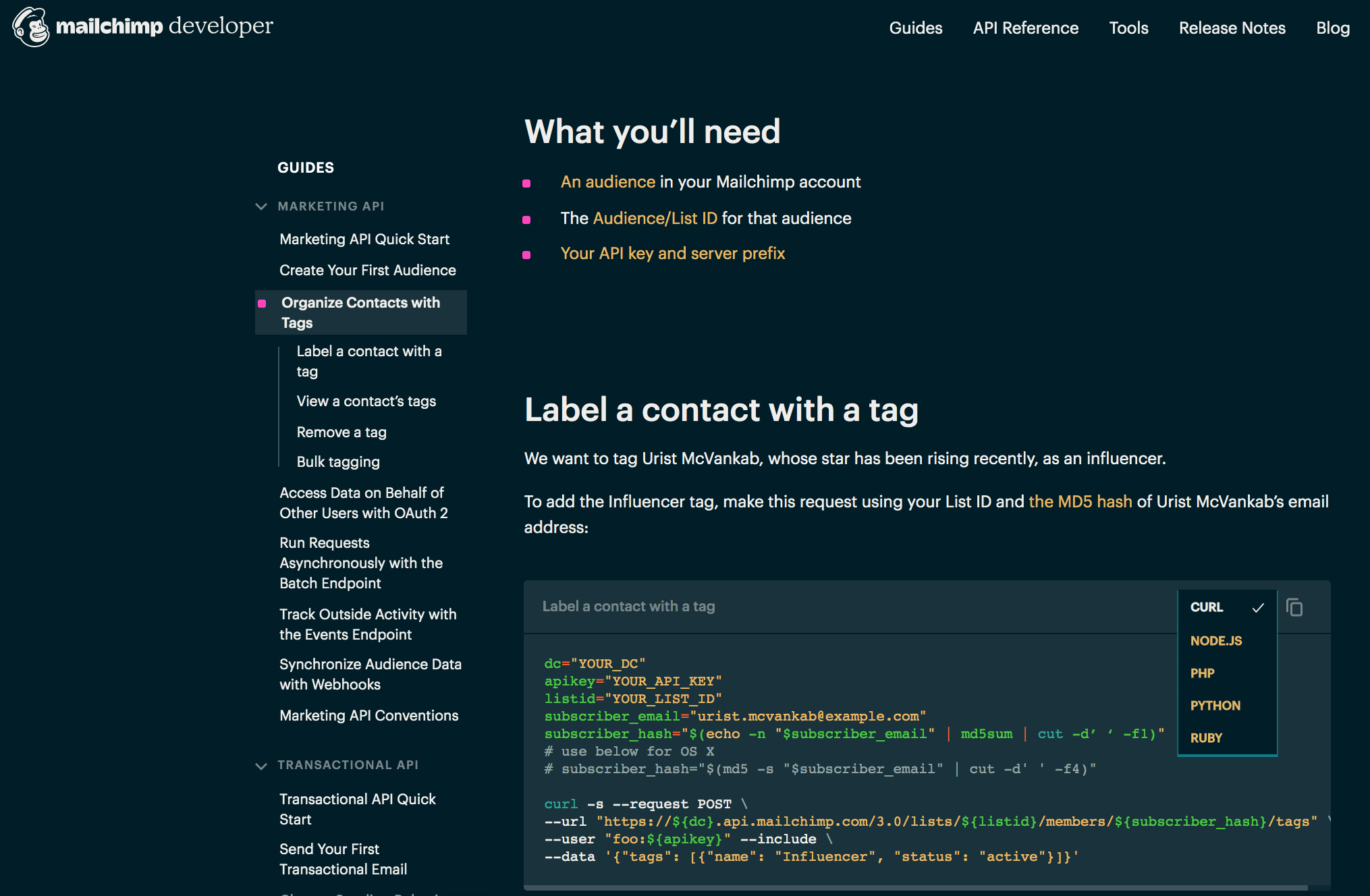 Mailchimp 意识到它的大多数受众是营销专业人士,并且使用的语言即使是非技术人员也能理解如何使用其 API。一目了然,每个部分都遵循相同的结构: