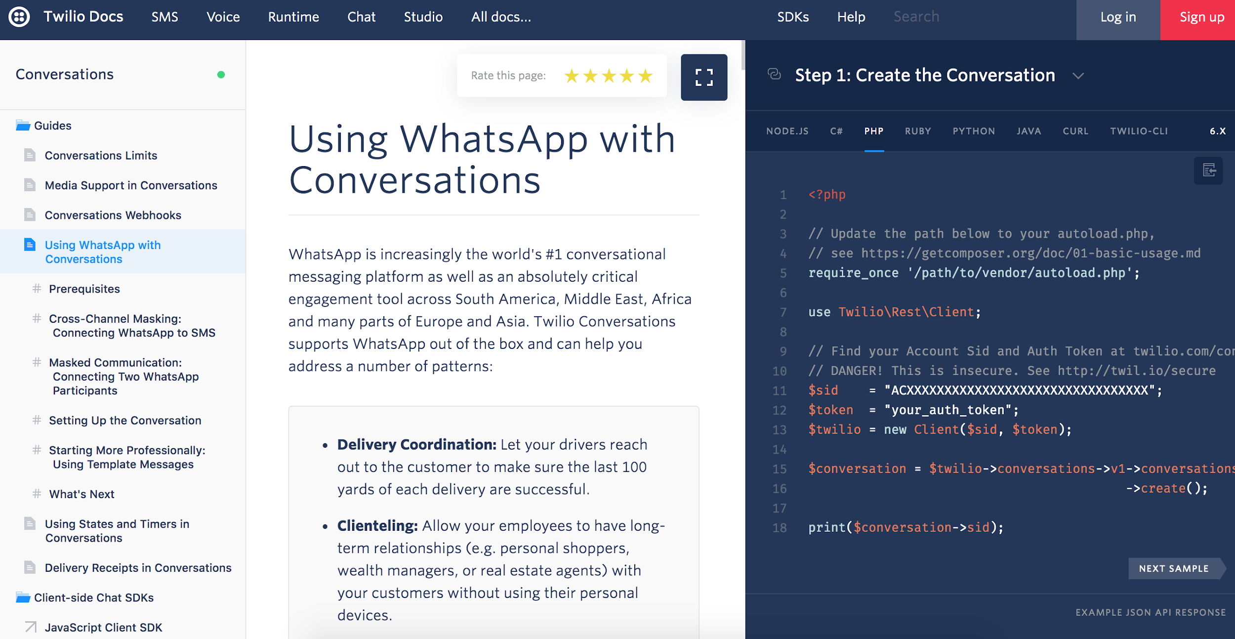 Twilio 拥有著名的优秀API 文档。尽管文档只是 Twilio 共享的所有帮助的冰山一角,但有多种语言的 SDK 和适用于 iOS、Android 和 Web 的示例应用程序。首先,它们遵循三列逻辑,代码直接位于指南右侧。用详细信息和大量链接来解释最简单的操作,以获取更多信息和屏幕截图。还可以通过“评价此页面”按钮以及指向支持团队的链接和 StackOverflow 上的标签来鼓励反馈。
