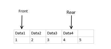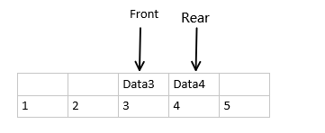回顾一下队列的性质,首先我们有一个顺序队列,这个队列的大小为5,其已经包含了四个元素data1,data2,data3,data4,接着,我们对这个队列进行出队操作,出队2个元素,队列就变成了这个样子: