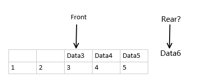 目前看起来没有问题,那么我们接着再进行入队操作,我们入队2个元素,分别是data5和data6,此时我们已经发现问题了,尾指针移动到我们可以进行队列操作的范围之外去了,我们称呼作为队列用的存储区还没有满,但队列却发生了溢出,我们把这种现象称为"假溢出"。