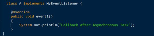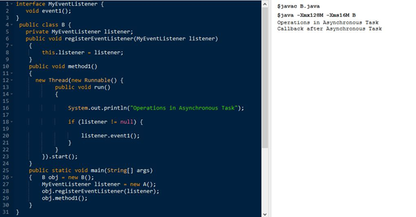 在上面的程序中,MyEventListener 是一个接口。它有一个名为 event1 的抽象方法。在 B 类中,有一个 MyEventListener 类型的监听器的声明。registerEventListener 将获取的值设置给监听器。method1 包含同步任务。“if”条件检查侦听器是否已注册。如果条件为真,则使用监听器调用类 A 的回调方法。