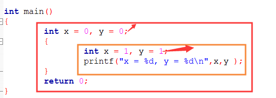 此时 int x = 1, y = 1;作用域较小会隐藏 x = 0, y = 0;的作用域。
