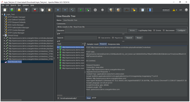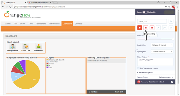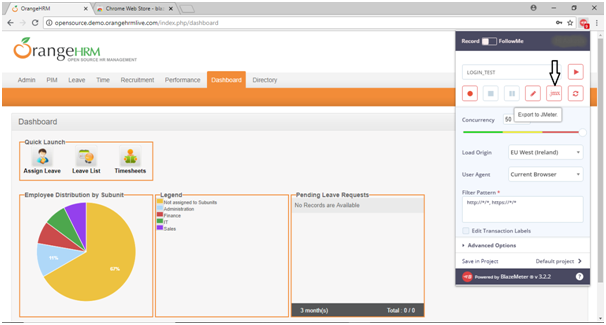 出于测试目的,我们将使用OrangeHRM在URL- http://opensource.demo.orangehrmlive.com 下提供的公开网站来记录成功登录其网站。还将使用BlazeMeter提供的chrome扩展,通过该扩展可以在chrome中记录用户操作,然后导出测试脚本。 随后,可以在JMeter中使用这些脚本来运行测试计划。