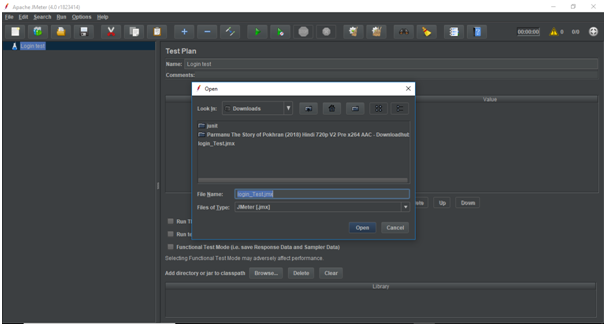 • 转到 File -> Open,选择下载的login_Test.jmx文件,然后单击打开。