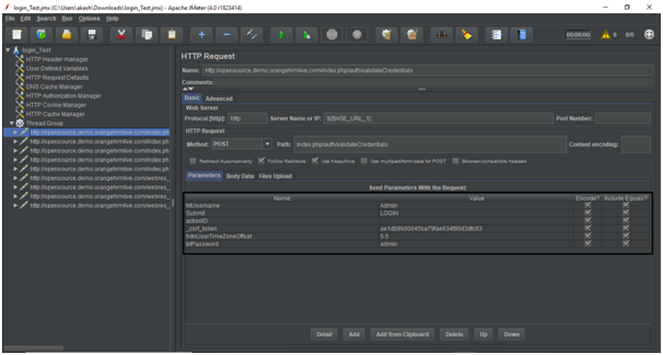 单击线程组下的第一个采样器,在这里可以查看用于登录OrangeHRM网站的登录凭据。