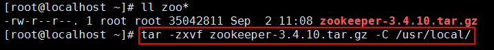 执行命令:tar -zxvf zookeeper-3.4.10.tar.gz -C /usr/local/