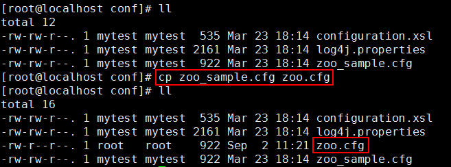 在 zookeeper 的 conf 目录下,将 zoo_sample.cfg 改名为 zoo.cfg,cp zoo_sample.cfg zoo.cfg