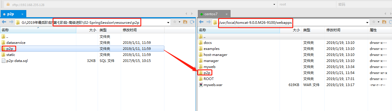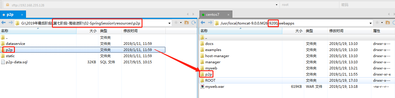 ① 使用Xftp将p2p上传到tomcat9100和9200的webapps目录下