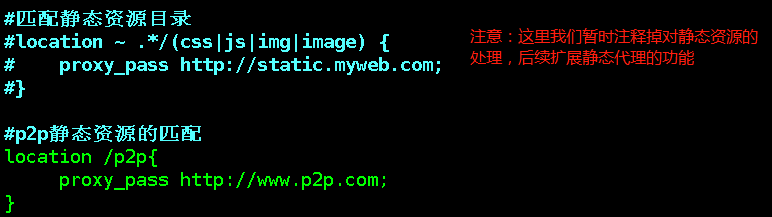 B、location匹配的配置,注意:这里对静态资源的处理,我们暂时先注释掉