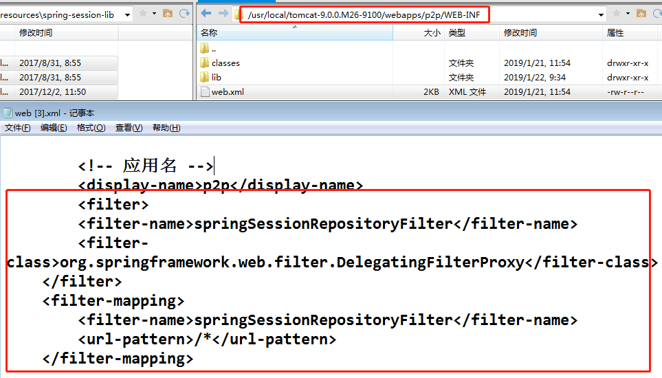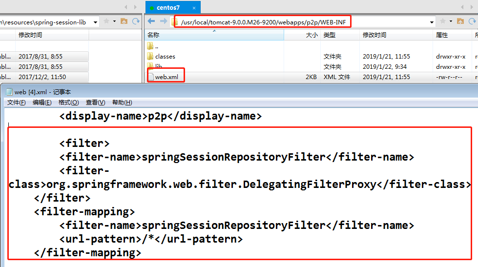 修改tomcat9100和tomcat9200的p2p项目的web.xml配置文件,添加Spring Session过滤器,因为我们项目本身已经通过springMVC启动了容器,所以spring监听器不需要加了,直接从01-springsession-web中拷贝即可;