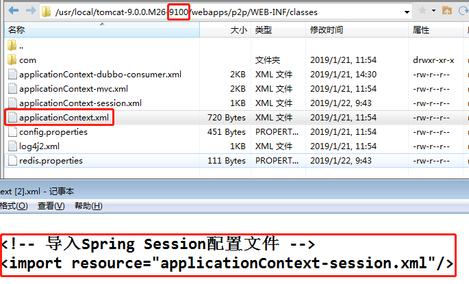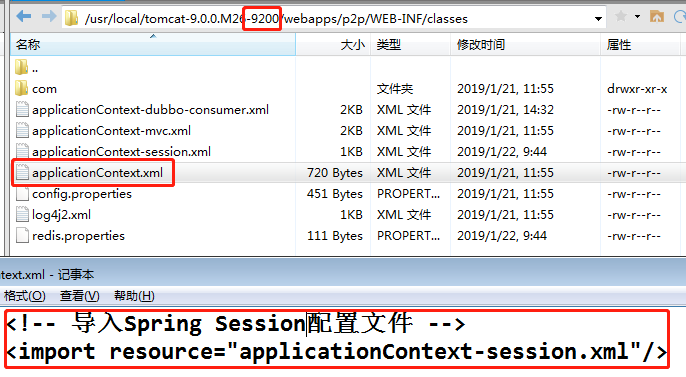 修改tomcat9100和tomcat9200的p2p项目WEB-INF/classes下applicationContext.xml文件,引入applicationContext-session.xml