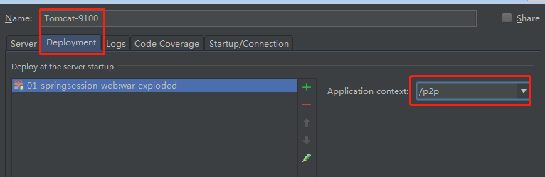 ② 在Deployment选项卡下,设置本地tomcat9100的Application context为/p2p