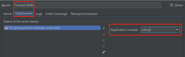 ③ 在Deployment选项卡下,设置本地tomcat9200的Application context为/shop