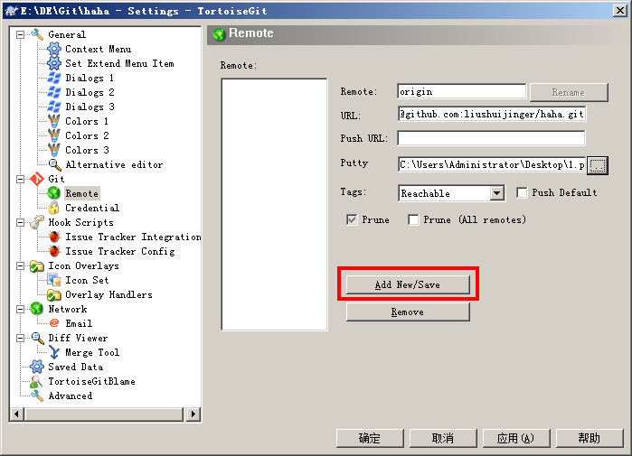 URL填入刚才新建库的SSH URL,Putty导入之前的私钥,点击“Add New/Save”,“确定”——>“OK”,等待完成即可看到已经将本地的项目push到了服务器。