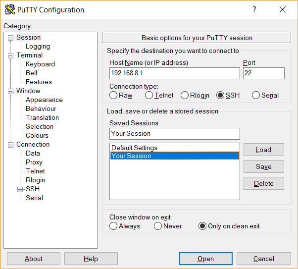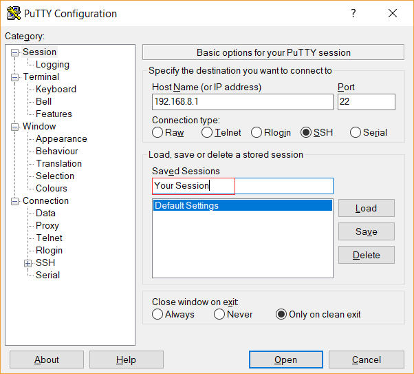 输入主机名(或IP地址)192.168.8.1,保持端口默认22,选择连接类型:SSH,输入已Your Session保存的会话和Save您的内容。