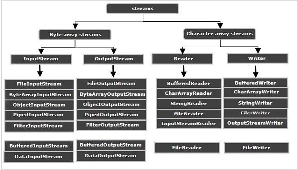 Byte Streams - 这些以字节(8 位)处理数据,即字节流类读/写 8 位数据。使用这些,您可以存储字符、视频、音频、图像等。