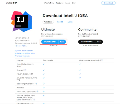 (3)选择对应系统版本下载,官网上提供了 Windows,macOS 和 Linux 三个操作系统,每个系统都有两个版本可供下载: Ultimate 和 Community。