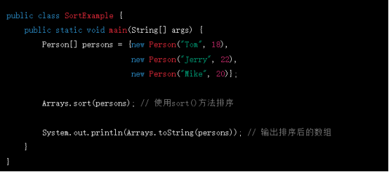 上述代码中,定义了一个Person类,并实现了Comparable接口,重写了compareTo()方法,按照年龄从小到大排序。在SortExample类中,定义了一个Person类型的数组persons,并使用Arrays.sort()方法对其进行排序。最后使用Arrays.toString()方法输出排序后的数组。