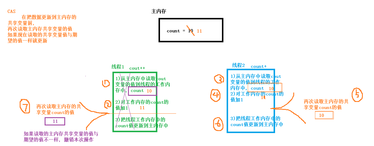 CAS原理:在把数据更新到主内存时,再次读取主内存变量的值,如果现在变量的值与期望的值(操作起始时读取的值)一样就更新。
