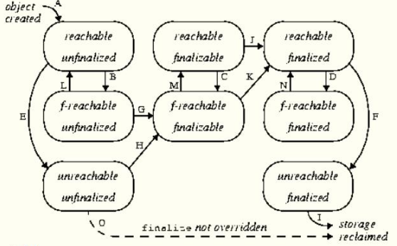 (3)若JVM检测到处于unfinalized状态的对象变成f-reachable或unreachable,JVM会将其标记为finalizable状态(G,H)。若对象原处于[unreachable,unfinalized]状态,则同时将其标记为f-reachable(H)。