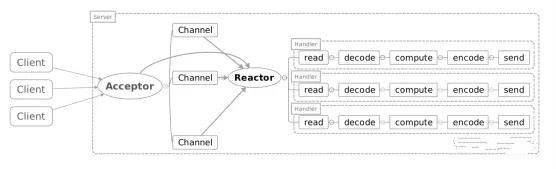一个Acceptor线程,监听Accept事件,负责接收客户端的连接SocketChannel,SocketChannel注册到Selector上并关心可读可写事件。一个Reactor线程,负责轮训selector,将selector注册的就绪事件的key读取出来,拿出attach任务Handler根据事件类型分别去执行读写等。