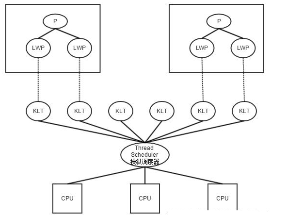 程序一般不会直接使用内核线程,而是去使用内核线程的一种高级接口—轻量级进程(LWP),轻量级进程就是我们所讲的线程,这种轻量级进程与内核线程之间1:1的对应关系。