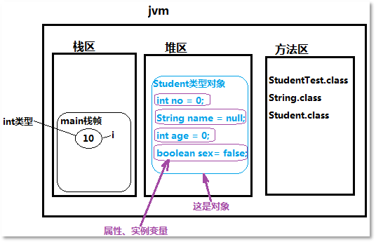 上图中堆区当中的称为“对象”,该“对象”内部no、name、age、sex都是实例变量/属性,这些变量在new对象的时候初始化,如果没有手动赋值,系统会赋默认值。