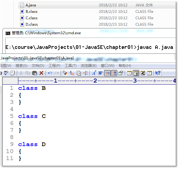 通过以上的测试可以得出:一个java源文件中可以定义多个class,并且在编译的时候一个class会对应编译生成一个class字节码文件。还有,public的class可以没有。