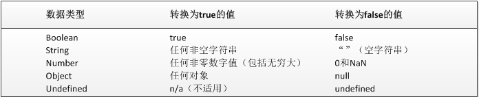 在这个例子中,字符串message被转换成了一个Boolean值,该值被保存在messageAsBoolean变量中。可以对任何数据类型的值调用Boolean()函数,而且总会返回一个Boolean值。至于返回的这个值是true还是false,取决于要转换值的数据类型及其实际值。下表给出了各种数据类型及其对象的转换规则。